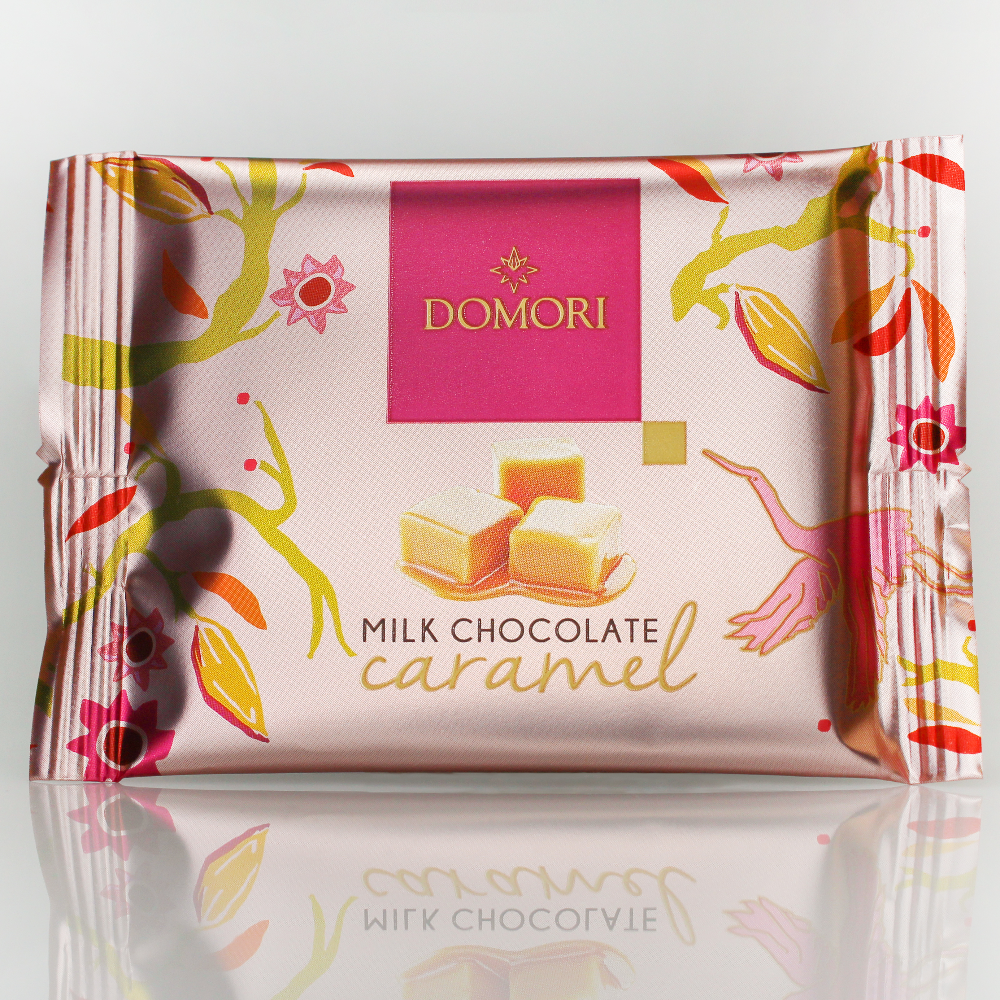 Rispetto alle altre tavolette realizzate dall’azienda, il packaging di Domori to go è una confezione flowpack, più leggera e portabile; la selezione Domori to go, inoltre, rappresenta un'ulteriore evoluzione del packaging all'insegna della sostenibilità. L’abbinamento latte/caramello permette al sapore antico del caramello, oggi ritornato di grande attualità, di incontrare il cioccolato al latte per offrire un'esperienza di gusto classico, dalla dolcezza avvolgente e confortante.